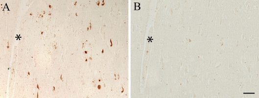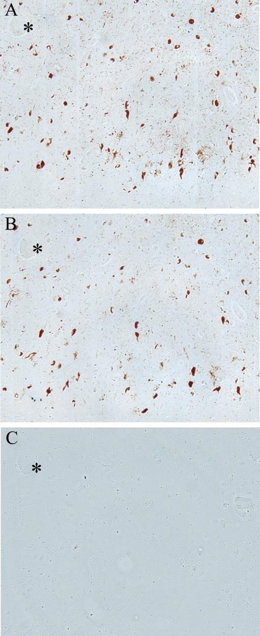 All AD cases examined, both with formalin and methacarn fixation, contained many immunoreactive NFT throughout the hippocampus. Additionally, the binding of the anti-pMcm2 antibody to NFT within AD brains was striking and showed some co-localization with phosphorylated tau on adjacent sections of AD tissue In particular, many of the same NFT and senile plaques demonstrated co-localization of tau with pMcm2 in all AD cases (Figure 2). In Figure 3, the specificity of the antibody to pMcm2 protein was confirmed by absorbing antibodies to pMcm2 with phosphorylated and non-phosphorylated peptides. As expected, the phosphorylated peptide completely absorbed the antibody producing no visible staining on the section (Figure 3C) whereas the peptide lacking phosphorylation failed to absorb the antibody (Figure 3B) and produced staining similar to that of the unabsorbed sample (Figure 3A). Further confirmation of the specificity was obtained by treating some sections with alkaline phosphatase to remove phosphate groups. Figure 4 shows that nearly all of the reactivity of the pMcm2 antisera is abolished following dephosphorylation on adjacent sections with (Figure 4B) and without (Figure 4A) alkaline phosphatase pretreatment.