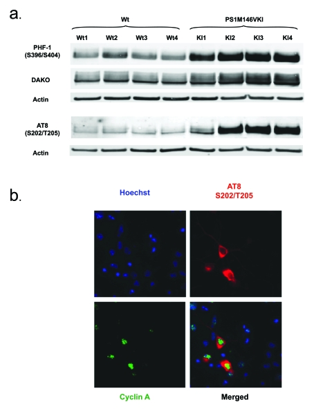 Interestingly, and consistent with the notion that a highly specialized cytoskeleton may be the origin of cell cycle-driven apoptosis by simply preventing a cycling neuron from undergoing chromosome segregation and cytokinesis, we have found profound abnormalities in tau homeostasis in our PS1 FAD mouse model. Specifically, tau is hyperphosphorylated in mitotic epitopes in these mice (Figure 2a) and, perhaps more importantly, nuclear expression of cyclin A appears to correlate with the tau phosphorylation at S202/T205 (Figure 2b).