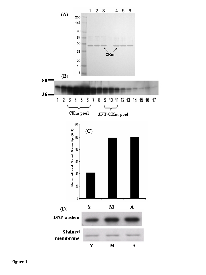Reduction of CKm activity may be a major contributor to the gradual loss of muscle function associated with aging. Several lines of investigation have shown age-related reductions in skeletal muscle oxidative capacity in rodents and humans [8,9]. Additionally, recent proteomic-liquid chromatography-tandem mass spectrometry (LC-MS/MS) experiments have definitively shown that CKm is 3-nitrotyrosine (3-NT) modified within aged skeletal muscle and a novel approach using the fluorescent probe 4,4-dianilino-1,1-binaphthyl-5,5-disulfonic acid (BisANS) suggests that the three dimensional structure of CKm is altered during aging [10-12]. Furthermore, in crude extracts prepared from human brains, reduced activities for aged samples compared to young controls parallel the increases of CKb carbonylation [13]. However, the consequences of oxidative modification of CKm to its structure and function and its contribution to the age-related decrease in skeletal muscle function is not understood.