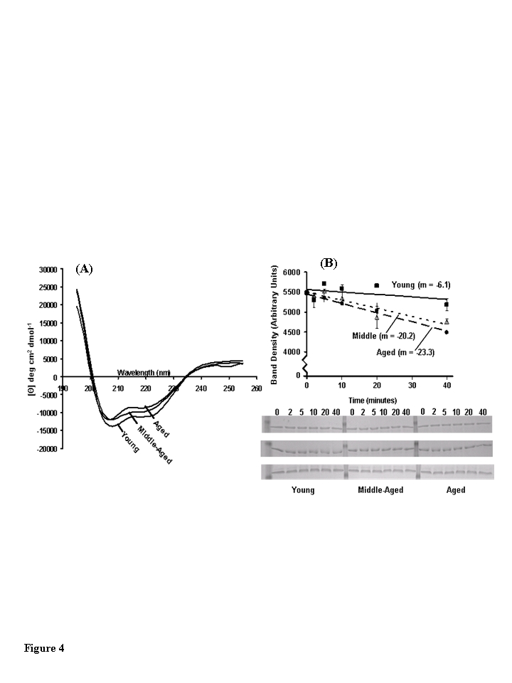 The stability of CKm purified from differently aged mouse quadriceps was analyzed by limited chymotrypsin digestion and SDS PAGE (Figure 4B). CKm purified from middle-aged and aged mice is digested approximately 3.5 times faster than CKm purified from young mice. The rates of proteolysis are given on Figure 4B. These results are consistent with several studies that have documented the proteolytic resistance of CKm [23]. Furthermore, Zhao et al. [7] showed that structural alteration of oxidized CK (O-CK) renders the enzyme more susceptible to proteolysis by both trypsin and proteinase K. Regardless of age group, no proteolytic fragments were observed during the limited chymotrypsin digestion whereas the amount of full length protein decreases throughout the time course and the rates of proteolysis vary among age groups. Taken with the results from our CD experiments (Figure 4A) these data suggest that CKm purified from middle-aged and aged mice is less resistant to proteolysis suggesting that it is structurally less stable than CKm purified from young mice.