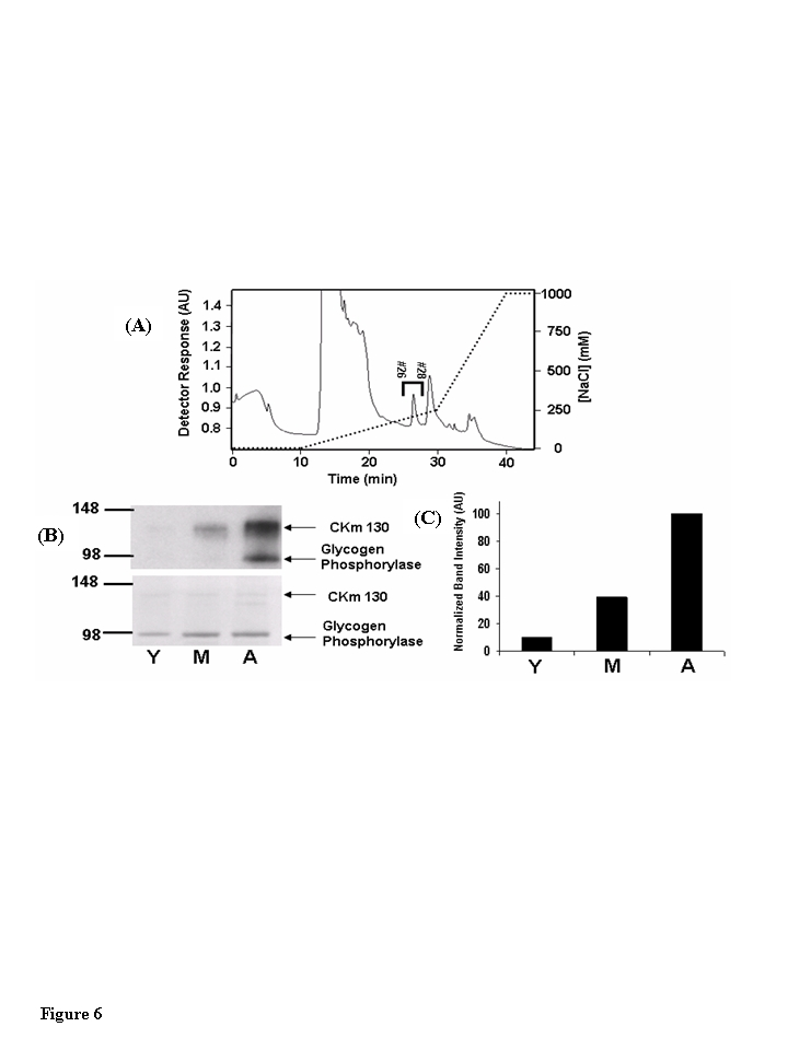 Enrichment of high molecular weight CKm protein species. Soluble quadriceps protein from all three age groups was fractionated on a 5 ml Blue Sepharose affinity column (Amersham Biosciences, HiTrap Blue HP). After sample loading, the column was washed with 10 ml of 50 mM sodium phosphate pH 5.8 and developed with a 30 ml linear pH gradient (pH 5.8 to pH 10.0). Flow rate equaled 1 ml/min throughout purification and fractions were collected at a rate of one fraction per minute. Fractions containing anti-CKm immuno-reactive proteins with apparent masses of 88 and 130 kDa were pooled from young, middle-aged and aged mouse samples and individually loaded onto a 1 ml mono-Q-Sepharose column (Bio-Rad Laboratories). After application, the column was washed with 10 ml of 25 mM Tris (pH 8.0), developed with a shallow 20 ml linear NaCl gradient (0-250 mM NaCl in 25 mM Tris pH 8.0), followed by a steep 10 ml NaCl gradient (250mM - 1M NaCl in 25 mM Tris pH 8.0). The flow rate equaled 1 ml/min throughout purification and fractions were collected at a rate of one fraction per minute.