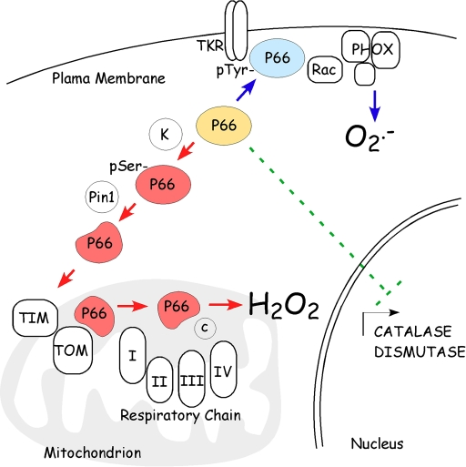 The import of p66shc into mitochondrial IMS is not still understood at a mechanistic level. However, a mechanism that depends on p66Shc post-translational modifications, including serine phosphorylation by stress kinases like Jnk-1 and Pkc-B and prolilisomerization by Pin-1, has been described, which allows p66Shc increase within the mitochondria during apoptosis [22]. A second level of activation of p66Shc mitochondrial function is represented by the effective amount of p66Shc within mitochondrial vesicles. In fact, mitochondrial p66Shc has been observed to associate to a high molecular weight complex of about 670 KDa and to the mitochondrial chaperon mtHsp70 [23]. Notably, treatment of cells with pro-apoptotic stimuli such as UVC or H2O2 induces the dissociation of this complex and the consequent release of monomeric p66Shc,which is then free to react with cytochrome c [23].