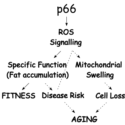 Was the p66Shc gene conserved during mammals development, in spite of its deleterious effects on life-span and disease, because of p66Shc- mediated ROS signaling function in fat tissues? P66Shc-/- mice have reduced body weight, due to reduced fat mass of both white and brown adipose tissues [17]. This leanness is not explainable by changes in food intake, intestinal absorption of nutrients or locomotor activity. Rather, it may reflect defective lipogenesis in adipocytes, as suggested by the reduced lipid accumulation of p66Shc-/- adipocytes transplanted into WT recipient mice [17]. However, this interpretation of the mechanisms leading to decreased fat mass in p66Shc-/- mice poses the question of how energy balance is maintained in the absence of p66Shc, and why energy storage is reduced. As p66Shc-/- mice showed increased basal body temperature and increased basal metabolic rate, this suggests that increased uncoupled respiration in the fat mitochondria of p66Shc-/- mice leads to increased energy expenditure, which contributes to resistance to body weight gain [17].