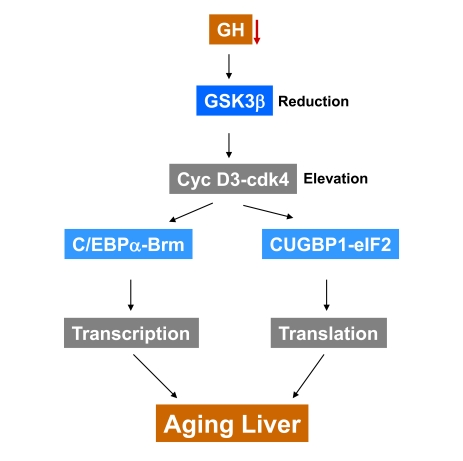 Age-associate inhibition of liver proliferation has been described over 50 years ago [2] and has been the subject of intensive investigations especially during last 6 years. The initial studies have been focused on the investigations of the role of individual genes in the inhibition of liver proliferation [3,4,5]. However, several recent papers have found that the inhibition of liver proliferation in old mice is associated with formation of multi-protein C/EBPα-Brm complexes in nucleus [6,7] and multi-protein complexes of RNA binding protein CUGBP1 with translation initiation factor eIF2 in cytoplasm [8,9,10]. Following studies showed that these complexes alter transcription and translation in livers of old mice [10-13]. It has been later shown that the activation of CUGBP1 in livers of old mice leads to the translational elevation of a chromatin remodeling protein histone deacetylase 1, HDAC1, which joins the C/EBPα-Brm complex and silences promoters of the cell cycle genes [10]. In addition to the intracellular alterations, Rando's group has found that systemic environment of young animals reduces C/EBPα-Brm complex and corrects liver proliferation [7]. We have recently found that glycogen synthase 3β, GSK3β, is a key enzyme which regulates these pathways in the liver and that the decline of GSK3β with age causes inhibition of liver proliferation via stabilization of cyclin D3 and following changes in transcription and translation [1]. This review discusses age-associated mechanisms of inhibition of liver proliferation in the light of this recent finding.