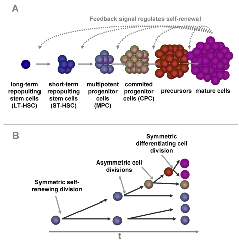 Hematopoiesis is a multi-step process, in which a relatively small population of HSC gives rise to all types of blood cells. The current understanding is based on a hierarchical tree in which each lineage of blood cells proceeds through a chain of maturation stages, which are sequentially traversed. At least six different compartments have been proposed although so far experimental data do not provide a precise distinction between these stages (Figure 1A): 1) A small subset of HSC is capable of long-term repopulation upon transplantation (LT-HSC). These cells can be enriched by their immunophenotype as CD34+CD38-CD90+ and they are usually quiescent or very slow dividing [7-11]. 2) The next compartment comprises short-term repopulating stem cells (ST-HSC) that sustain hematopoiesis only for a limited time of several weeks or months after transplantation and these may correspond to a CD34+CD38- phenotype [12]. 3) Multipotent progenitors cells (MPC; such as common myeloid progenitor cells) are included in the CD34+CD38+ cell fraction. In the later stages CD34 expression is absent and lineage specific markers are expressed. There is evidence that maturation proceeds via 4) committed progenitor cells (CPC; such as the granulocyte-macrophage colony-forming cells), 5) precursor cells with single-lineage potential (such as the granulocyte-progenitors) and ultimately 6) mature cells with a limited lifetime (such as granulocytes). Upon every cell division, some progeny cells have to maintain the stem cell pool (self-renewal), whereas the others proceed to the next maturation compartment (differentiation). There is evidence, that the relation between self-renewal and differentiation is controlled by asymmetric cell divisions and this correlates with asymmetric cell division kinetics of the progeny cells (Figure 1B) [13-15].