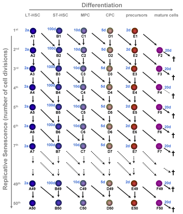We have developed a mathematical model describing the dynamics of cells of n different differentiation stages under the restriction that the number of possible cell divisions is limited by an arbitrary number m (see Methods for the details of the model). We have solved numerically the model with n=6 stages of maturation (long-term repopulating stem cells (LT-HSC), short-term repopulating stem cells (ST-HSC), multipotent progenitor cells (MPC), committed progenitor cells (CPC), precursors, and mature cells) andm=50 possible cell divisions (Figure 2). We assume that, neither proliferation rates nor self-renewal fractions, depend on the number of cell generation but they only depend on the stage of differentiation. For the initial cell numbers at birth (0 years) we have chosen cell numbers close to the steady states value of the model without replicative senescence (LT-HSC = 105; ST-HSC = 5x105; MPC = 4 x 106; CPC = 8 x 107; precursors = 1.5 x 108; mature cells = 1.5 x 109).
