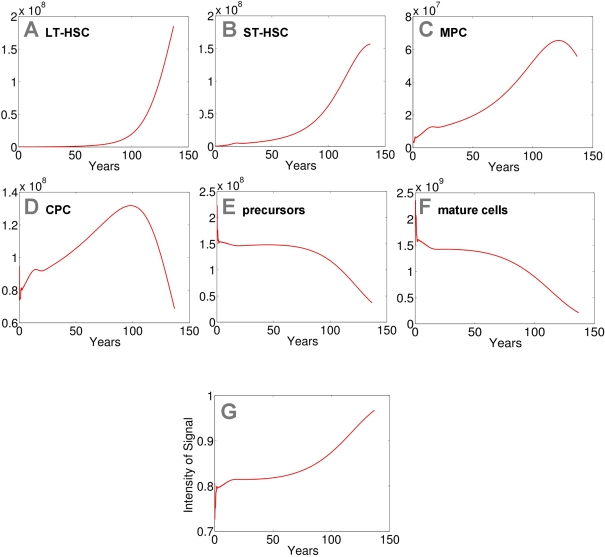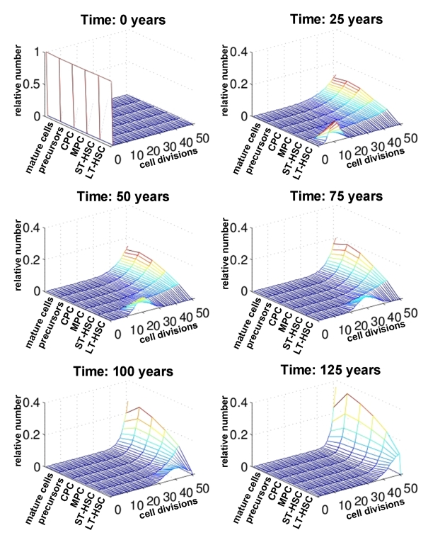 As anticipated a prerequisite for this model is that LT-HSC are very slow dividing. Otherwise, the stem cell pool is rapidly depleted. This might explain why ST-HSC cannot maintain hematopoiesis for a long time. We have chosen a proliferation rate of LT-HSC of once every two years with a maximum number of 50 cell divisions to adapt the results to a human life-time. Furthermore, the rate of HSC self-renewal (a1) has to be larger than the corresponding rates for the other compartments (a1>ai for i=2,3,4,5). Otherwise, the compartment with the highest self-renewal potential takes over the stem cell function, whereas all up-stream compartments including the HSC compartment eventually become extinct. This has also been described in our previous work. For numerical simulations we have chosen the same maximal self-renewal rates as in our previous work [23] (LT-HSC = 0.7; ST-HSC = 0.65; MPC = 0.65; CPC = 0.65; precursors = 0.55; mature cells do not divide). Under these assumptions our model demonstrates that hematopoiesis can be sustained over a life-time with only 50 cell divisions. However, hemato-poiesis does not reach a steady state. The number of mature cells slowly declines after about 50 years and after 140 years hematopoiesis ceases to take place.