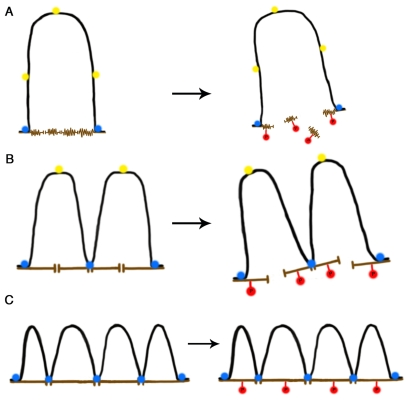 From the structural perspective, the topological organization of higher-order DNA structure based on selective use of a limited set of potential MARs (as seen in nuclei from newborn and baby animals) is highly asymmetrical and the natural trend for most physical systems is towards reducing the asymmetries in such a way that the system evolves in time so as to become more symmetrical [84-86]. A topological configuration in which most potential MARs are actually bound to the NM, thus resulting in shorter and more stable DNA loops, is also a more symmetrical structural attractor. Moreover, since entropy is not a measure of disorder or chaos, but of energy diffusion, dissipation or dispersion in a final state compared to an initial state [87], such a highly-stable DNA-loop configuration satisfies the second law of thermodynamics since the structural stress along the DNA molecule is more evenly dispersed within the nuclear volume by increasing the number of DNA-NM interactions (thus increasing, in terms of molecular thermodynamics, the occupancy of more microstates in phase space). A larger number of DNA-NM interactions create a structural complex, similar to a hanging bridge in which beams (proteins) and tensors (DNA) interact for creating a highly stable overall structure. Thus any relatively stable interaction between two NM-protein filaments will be further stabilized if a given DNA loop interacts with both filaments, but also the stability of the DNA loop shall be increased by the interaction with both protein filaments, resulting in a self-reinforcing structural stability that operates at the scale of the whole interphase nucleus (Figure 1).