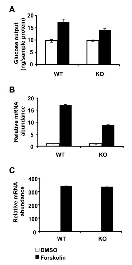 Another surprising phenotype observed in the SIRT1 LKO mice is their normal gluconeogenesis in response to a 16-h fasting [17]. The inducible coactivator PGC-1α is an important component of a number of transcriptional complexes that regulate glucose and lipid metabolism. Hepatic knockdown of SIRT1 significantly abrogates the fasting induction of gluconeogenic genes by regulating the acetylation status of PGC1α [11]. However, we observed no changes in fasting glucose levels in the absence of hepatic SIRT1 despite impaired PGC-1α signaling. Liver specific SIRT1 knockout mice had slightly higher, although not statistically significant, fasting glucose levels compared to littermate controls upon high-fat feeding. Expression levels of the two rate-limiting enzymes in the gluconeogenic pathway, PEPCK and G-6Pase, were also unchanged in the absence of hepatic SIRT1. Consistent with these observations, forskolin, an intracellular cAMP stimulator, promoted gluconeogenesis independently of SIRT1 levels in primary hepatocytes (Figure 1A). Additionally, although the forskolin-mediated induction of PGC1α expression was decreased in these cells (Figure 1B), the overall message levels of PEPCK remained similar between control and LKO hepatocytes (Figure 1C). Gluconeogenesis is regulated by a complex interplay between transcription factor and hormonal and coregulator signaling. While PGC-1α is known to control hepatic glucose production, other factors such as FOXO1 and TORC2 are reported to promote gluconeo-genesis [24]. Interestingly, SIRT1 has been shown to deacetylate and repress both FOXO1 [25] and TORC2 [24]. Therefore, a likely explanation for our findings is that while PGC-1α activity is lower in SIRT1 KO livers, compensatory effects of FOXO1 and TORC2 balance the reduction in PGC-1α signaling (Figure 2). Another possible explanation for the contradiction in these studies may lie in differences in cell types and method of SIRT1 deletion/knockdown used in the animal studies. It is important to note that the hepatic-specific albumin-Cre driven SIRT1 knockout mouse utilized in our study is a permanent knockout model. Phenotypes observed in these mice may reflect systemic and local compensatory effects in wake of hepatic deletion of SIRT1. Studies done by Rodger et al. [11] employed transient knockdown methods using adenovirus-mediated shRNA which seem to provoke more acute responses to loss of hepatic SIRT1.