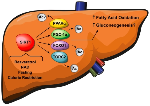 The liver is a central metabolic organ in charge of regulating nutrient homeostasis in fed and fasting conditions. It controls key aspects of lipid and glucose metabolism in response to nutritional and hormonal signals [7]. Tight regulation of glucose by the liver is essential to ensuring that glucose-dependent tissues such as brain and red blood cells have ample energy supply during periods of nutrient deprivation. Recent reports have shown that SIRT1 protein levels and enzymatic activity are induced in the fasted liver [8,9]. SIRT1 regulates genes involved in gluconeogenesis through deacetylation of several key transcription factors and coactivators [8,9,10]. The liver also plays an important role in maintaining lipid homeostasis. In line with its role as a metabolic mediator, SIRT1 is known to regulate genes involved in fatty acid oxidation and lipolysis [11]. Interestingly, the SIRT1 activator resveratrol has shown promise as a therapeutic agent for the treatment of metabolic diseases [12,13]. Mice fed a high-fat diet along with resveratrol remained lean and healthy compared to over-weight control animals [13]. Additionally, resveratrol significantly increased aerobic capacity, as evidenced by increased running time and elevated oxygen consumption in muscle fibers. Resveratrol treatment also protected mice against diet-induced-obesity and insulin resistance [12]. Groups are now focusing on the development of high affinity small molecule activators of SIRT1 as a therapeutic approach for treating diseases of aging such as type-2 diabetes [14].