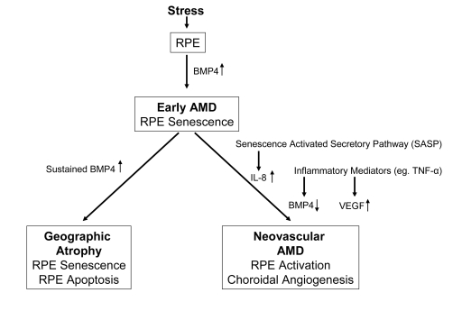 Much remains to be learned about the genetic and environmental factors mediating the progression of early AMD to its late forms. Our finding of differential expression of BMP4 in geographic atrophy and neovascular AMD and the interactive roles of oxidative stress, inflammation and senescence in the regulation and functional effects of this growth factor, suggests the possibility that BMP4 may be playing a part in the molecular switch determining which phenotypic pathway is taken in the progression of AMD.