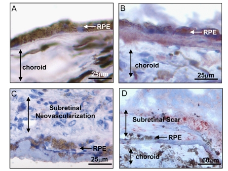 Recently, we reported that bone morphogenetic protein (BMP)4 is prominently expressed in the RPE and adjacent extracellular matrix of patients with the dry or atrophic form of AMD when compared to controls (Figure 2A, B). Here, we show that in the wet or neovascular form of the disease (5 patients with surgical excision of choroidal neovascular membranes due to neovascular AMD) there is almost no expression of BMP4 in the RPE and adjacent neovascular tissues (Figure 2C). Interestingly, in cases (3 patients) in which the neovascular lesion had progressed to a fibrous scar, the level of BMP4 expression increased in the RPE and adjacent tissues (Figure 2D). This has led us to the hypothesis that BMP4 may be a molecular switch participating in the pathway decision that determines which form of late AMD develops.