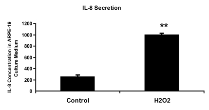 It remains unanswered why some patients develop atrophic AMD while others develop the neovascular form of the disease. The switch between dry and wet AMD may be related to differences in the microenvironment created by senescent RPE cells, which secrete a number of cytokines and growth factors [25]. The defined components of this "senescence associated secretory phenotype" (SASP) include elements associated with inflammation, and angiogenesis, such as interleukin (IL)-6 and IL-8 [26-28]. We have found that RPE cells induced into senescence by chronic oxidative stress secrete 4 times higher IL-8 than non-senescent RPE cells (Figure 3). IL-8 promotes angiogenesis by increasing the proliferation, survival and migration of endothelial cells and promotes inflammation by increasing neutrophil chemotaxis and degranulation [29-31]. Together these findings suggest that chronic oxidative stress increases the premature senescence of RPE. If RPE do not go down the cell death pathway to atrophic AMD, the senescent RPE may secrete high levels of IL-8, which in turn stimulate inflammation and angiogenesis. But what about the finding that neovascular AMD lesions show minimal levels of BMP4? In other cell types, pro-inflammatory mediators such as tumor necrosis factor (TNF)-alpha have been shown to downregulate BMP4 expression [32]. In the absence of BMP4, neovascular endothelial cells, stimulated by increased expression of vascular endothelial growth factor, and without the growth inhibitory senescence and cell death effects mediated by BMP4, would be in a permissive environ-ment for angiogenesis [5]. This idea is further supported by the finding that when neovascular AMD lesions undergo subsequent scar formation, with degeneration and loss of neovascular endothelial cells, there is a concomitant increase in BMP4 expression (Figure 2).