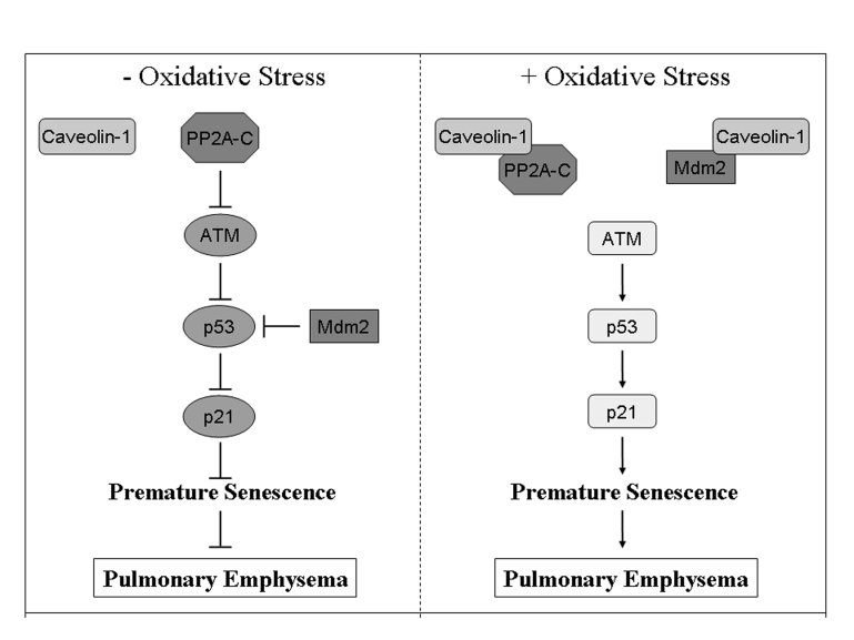We have recently shown that cigarette smoke extracts induced premature senescence of lung fibroblasts in a caveolin-1-dependent manner [33]. More specifically, the number of senescent cells was dramatically reduced and the up-regulation of p53 and p21Waf1/Cip1 was significantly inhibited in lung fibroblasts derived from caveolin-1 null mice, which do not express caveolin-1, after treatment with cigarette smoke extracts. Co-treatment with antioxidants prevented the ability of cigarette smoke extracts to induce premature senescence of lung fibroblasts, suggesting that oxidants contained in cigarette smoke extracts were responsible for the observed senescent phenotype. We also identified a mechanism through which oxidative stress induces premature senescence of lung fibroblasts. Free radicals have been shown to activate the ATM protein kinase [34], a key activator of p53. We found that sequestration of PP2A-C, an ATM inhibitor, into caveolar membranes was required for the activation of ATM and up-regulation of p53 in wild type fibroblasts upon oxidative stress [33]. Cigarette smoke extracts failed to activate ATM and up-regulate p53 in caveolin-1 null lung fibroblasts [33].