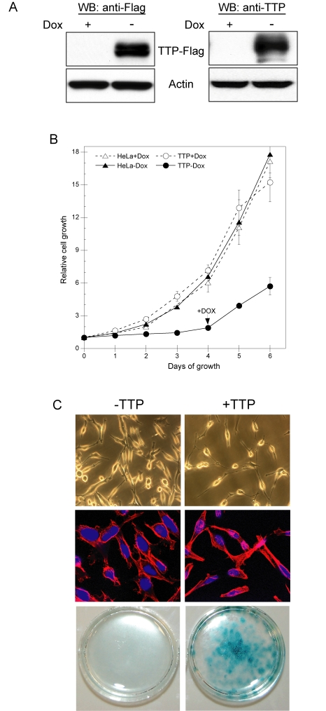 Cell growth and senescence. Cell growth was assayed using the MTT-based cell growth determination kit (Sigma) as previously described [68]. For cellular senescence studies, 1 x 104 HeLa Tet-Off/TTP-Flag cells were grown in 35mm diameter dishes in the presence or absence of 2 μg/ml Dox. Twelve days later, the cells were stained at pH 6.0 with X-Gal (5-bromo-4-chloro-3-indolyl-β-D-galactopyranoside; Cell Signaling Technology) to visualize senescence associated-β-galactosidase (SA-β-gal) activity.