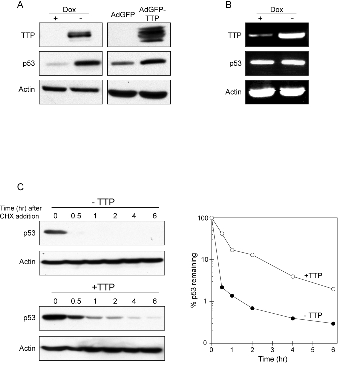 Fluorescence microscopy. HeLa Tet-Off/TTP-Flag cells were plated on coverslips in a 24-well plate and grown in the presence or absence of 2 μg/ml Dox. After 48 hrs, the cells were fixed in 4% paraformaldehyde for 10 min and permeabilized with 0.1% Triton X-100 in PBS for 5 min. The cells were blocked with 10% normal goat serum and 3% BSA diluted in PBST (PBS + 0.1% Tween-20) for 1 hr. Cells were incubated for 1 hr at RT with anti-p53 antibody (DO-1, Calbiochem; 1:100) diluted in blocking buffer. After washing, the cells were incubated with fluorescein-conjugated goat anti-mouse secondary antibody (MP Biomedicals; 1:150) for 1 hr at RT. DAPI (Invitrogen) was used for nuclear counter-staining. Coverslips were mounted on glass slides and visualized using an Axiovert 200 inverted microscope (Zeiss). Cell morphology was examined by staining fixed and permeabilized cells with DAPI and rhodamine phalloidin (Invitrogen) according to the vendor's instructions.