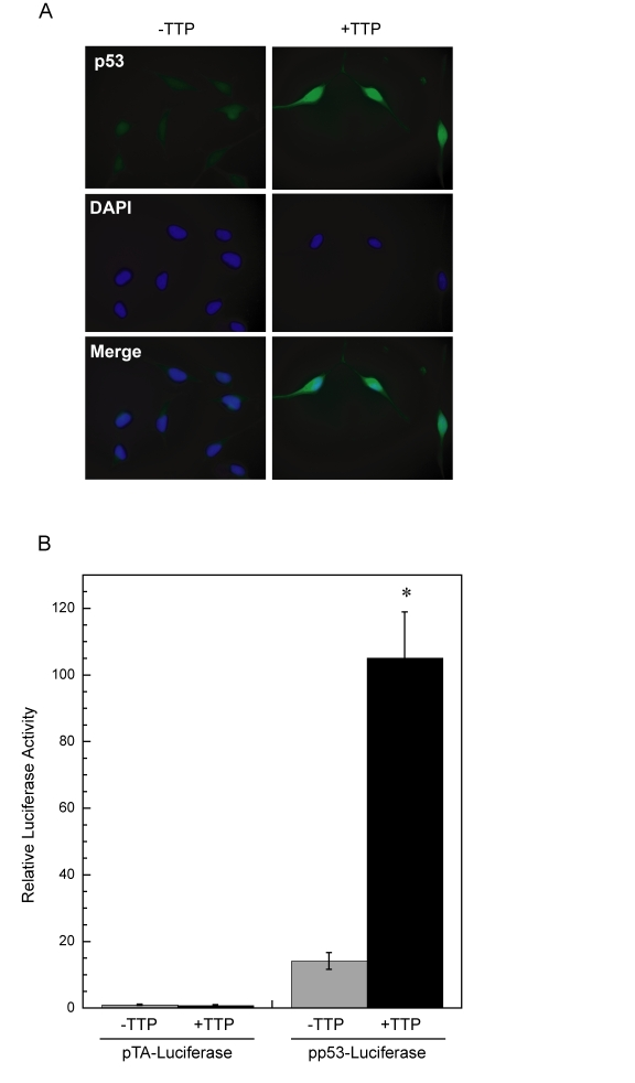 Activation of p53 promotes its accumulation in the nucleus and transcription of p53-responsive promoters [28,29]. To determine if nuclear localization of p53 is occurring in cells expressing TTP, HeLa Tet-Off/TTP-Flag cells were examined for p53 localization by immunofluorescence. In cells grown in the presence of TTP, p53 was detected in both the nucleus and cytoplasm with a high level of p53 localized to the nucleus (Figure 3A). In parallel experiments, a reporter construct containing a p53-dependent promoter was transfected into HeLa Tet-Off/TTP-Flag cells and its activity was examined in the presence and absence of TTP (Figure 3B). The magnitude of promoter activity was significantly increased in the presence of TTP, consistent with observed p53 protein stabilization and nuclear localization promoted by TTP.
