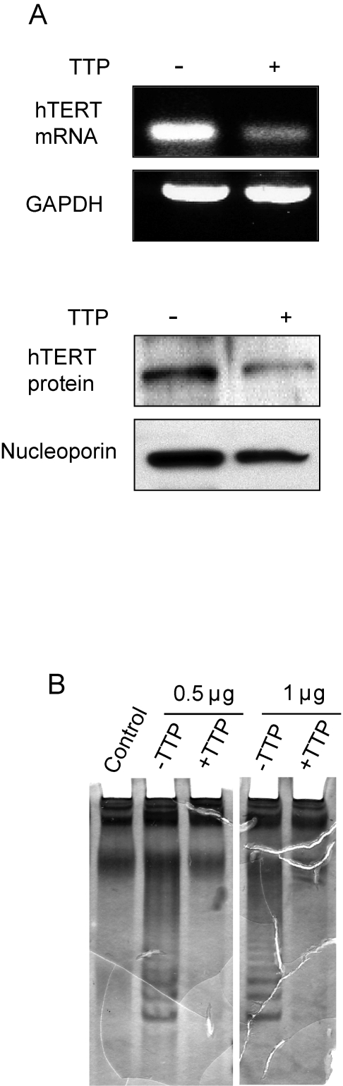 Elevated telomerase activity is associated with approximately 85% of human cancers [30]. In cervical cancers, the HPV E6 protein induces telomerase activity by promoting expression of the catalytic subunit of telomerase, hTERT [31]. To determine if TTP expression impacted hTERT levels, HeLa Tet-Off/TTP-Flag cells were grown in the presence and absence of Dox for 48 hr and hTERT mRNA and protein was evaluated. As shown in Figure 4A, steady state levels of both hTERT mRNA and protein were dramatically reduced in presence of TTP. Consistent with this inhibition, a decrease in telomerase activity was also detected (Figure 4B). In cells expressing TTP, a decrease in the characteristic laddering using a telomeric repeat amplification protocol (TRAP) assay was observed indicating that TTP inhibits telomerase activity through inhibition of hTERT expression.