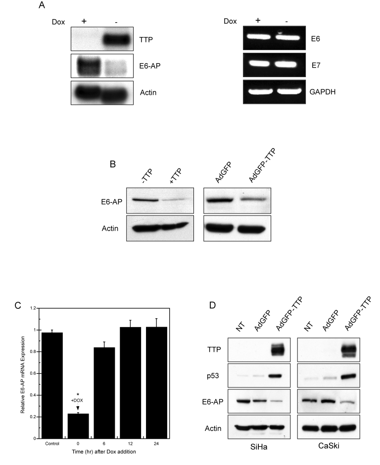 mRNA analysis. Total RNA was extracted from cells using Trizol reagent (Invitrogen). Northern blotting was performed as previously described [67] and probed with P32-labeled DNA probes synthesized for TTP, E6-AP and actin (Promega). cDNA synthesis and RT-PCR analysis of mRNA was accomplished as described [66]. The sequences for PCR primers used were: TTP sense, 5'-TCCACAACCCTAGCGAAGAC-3' and TTP anti-sense, 5'-GAGAAGGCAGAGGGTGACAG-3'; p53 sense, 5'-CAGCCAAGTCTGTGACTTGCACGTAC-3' and p53 antisense, 5'-CTATGTCGAAAAGTGTTT CTGTCATC-3'; hTERT sense, 5'-GTGACCGTGGTT TCTGTGTG-3' and hTERT antisense, 5'-TCGCCTGA GGAGTAGAGGAA-3'; HPV18 E6 sense, 5'-CGCGC TTTGAGGATCCAA-3' and HPV18 E6 antisense, 5'-TATGGCATGCAGCATGCG-3'; HPV18 E7 sense, 5'-TATGCATGGACCTAAGGCAAC-3' and HPV18 E7 antisense, 5'-TTACTGCTGGGATGCACACC-3'; E6-AP sense, 5'-GCTTGAGGTTGAGCCTTTTG-3' and E6-AP antisense, 5'-CCAATTTCTCCCTTCCTTCC-3'; GAPDH sense, 5'-CCACCCATGGCAAATTCCAT GGCA-3' and GAPDH antisense, 5'-TCTAGACGGCA GGTCAGGTCCACC-3'. Real-time PCR (qPCR) was performed using the 7300 Real-Time PCR Assay System (Applied Biosystems) with SYBR green PCR master mix (Applied Biosystems) and primers for E6-AP and GAPDH according to the vendor's protocol.