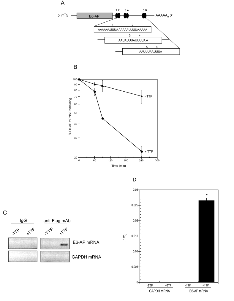 To determine if this shortening of half-life was a result of TTP binding to E6-AP mRNA, cytoplasmic extracts from HeLa Tet-Off/TTP-Flag cells grown in the presence and absence of TTP were subjected to immunoprecipitation using anti-Flag antibody or control IgG. Co-immunoprecipitated mRNA was reverse transcribed and PCR amplified using primers specific for E6-AP and GAPDH. Shown in Figure 6C, E6-AP was amplified from TTP expressing cells while no products were detected in control reactions. Samples were also analyzed by qPCR and the Ct values were used to detect the presence of a specific mRNA (Figure 6D). Ct value for E6-AP was 38 in the mRNA pool from TTP expressing cells and undetectable in cells absent of TTP. Ct values were undetectable for GAPDH mRNA indicating its absence in both experimental and control immunoprecipitations.