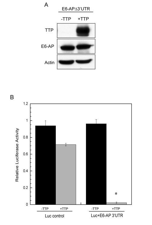 To determine if the ARE-containing 3'UTR of E6-AP mediated post-transcriptional regulation through TTP, HeLa Tet-Off/TTP-Flag cells were transiently transfected with a cDNA expression construct containing the 2.5 kb coding region of E6-AP (E6-APΔ3'UTR), and protein expression was assayed in the presence or absence of TTP. We found no TTP-dependent changes in the amount of E6-AP protein expressed when the 3'UTR was absent (Figure 7A) and expression of E6-APΔ3'UTR completely abrogated TTP-mediated stabilization of p53 and subsequent p53-dependent transcriptional activity (data not shown). The ability of the E6-AP 3'UTR to confer TTP-dependent mRNA instability to a reporter was tested by transfecting HeLa cells with a luciferase reporter containing the 1.6 kb E6-AP 3'UTR (Luc+E6-AP 3'UTR) along with a TTP expression construct. As seen in Figure 7B, the E6-AP 3'UTR significantly inhibited luciferase expression in presence of TTP, whereas control transfections using luciferase without a 3'UTR was inhibited by TTP to a much lesser extent. Taken together, these results indicate E6-AP mRNA to be a novel target of TTP-mediated mRNA decay through its ARE-containing 3'UTR.