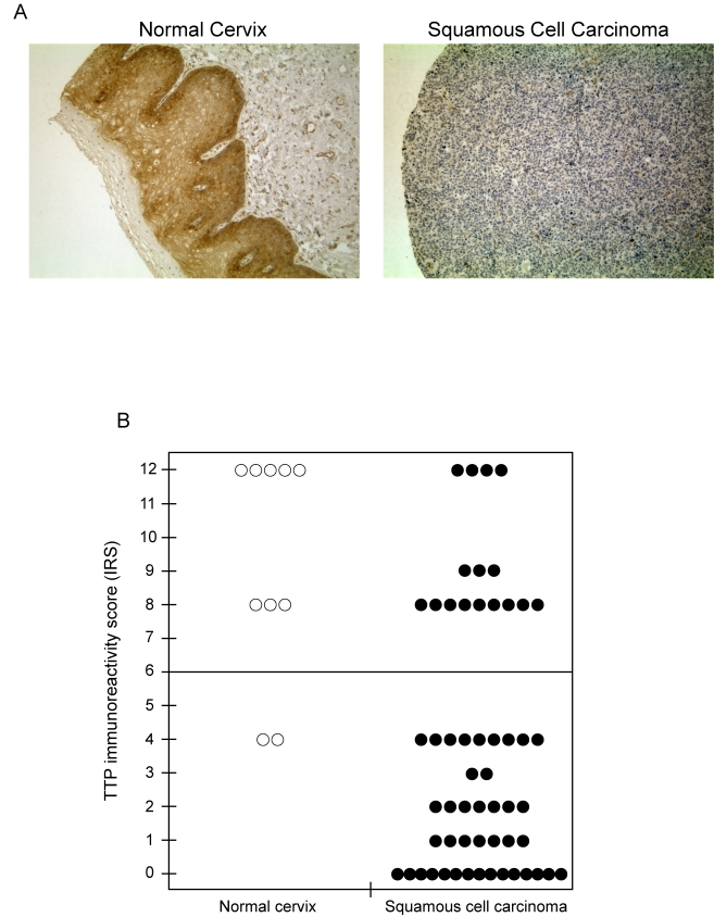 Based on its ability to target E6-AP mRNA for rapid decay, these results suggested that the presence of TTP would be inhibitory to HPV-mediated tumorigenesis and loss of TTP would be observed in cervical cancer. To test this, TTP expression was evaluated by immunohistochemistry using human tissue arrays containing cervical tissue sections from both normal and squamous cell carcinoma (Figure 8A). In normal cervical tissue (left panel) strong cytoplasmic staining of TTP was observed in the cells of squamous epithelium, whereas TTP immunoreactivity was negative or substantially decreased in tissue sections from squamous cell carcinomas (right panel). Tissue sections were assigned immunoreactivity scores (IRS) and grouped as low IRS of 0 to 6 or high IRS of 7 to 12 (Figure 8B). In normal tissue, TTP immuno-reactivity was high (median IRS of 10) in 8 of 10 (80%) samples, while expression was significantly lower (median IRS of 2) in 40 of 56 squamous cell carcinoma samples (71%, P < 0.001). These results are consistent with recent findings demonstrating elevated TTP mRNA levels to be present in normal cervix tissue [36] and suggest that loss of TTP expression in cervical cancer cells allows for aberrant mRNA stabilization and enhanced expression of E6-AP.