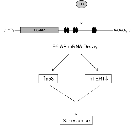 The results presented here provide a novel link between post-transcriptional gene regulation and HPV-associated cervical tumorigenesis. Based on these findings we conclude that TTP promotes cellular senescence in cervical cancer cells through rapid decay of E6-AP mRNA leading to p53 protein stabilization and inhibition of hTERT transcription. Moreover, absence of TTP expression in cervical cancer strongly implicates that loss of TTP expression is a critical step that occurs early in HPV-mediated carcinogenesis. These findings demonstrate the novel ability of TTP to servein a tumor suppressor capacity by regulating ARE-mRNA gene expression and identify how defects in post-transcriptional regulation can contribute to tumorigenesis.