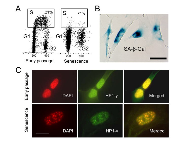 Cellular senescence is a state in which cells irreversibly lose their ability to proliferate after a finite number of divisions in culture [1]. Senescent cells are viable and metabolically active, but unable to replicate their DNA [2,3]. They are distinguished from their proliferating counterparts by increased size, flat morphology, elevated activity of senescence-associated β-galactosidase (SA-β-Gal) [4], and formation of characteristic senescence-associated heterochromatin foci (SAHF) [5]. Telomere shortening, a consequence of repeated cycles of DNA replication is thought to be a critical trigger of senescence [6,7] which also involves activation of two major tumor suppressor pathways, p53 and Rb [2,8,9]. Cellular senescence may lead to aging, a process associated with a reduced capacity of tissue regeneration and decline of physiological functions [9]. Although a direct link between senescence and aging has not been established, it has been suggested that senescence contributes to aging in several ways [10]. Accumulation of senescence cells may change tissue morphology and reduce its functionality. Senescence may also compromise tissue repair and renewal due to the lack of cell division. Markers of senescence such as increased SA-β-Gal staining have been frequently observed in aging tissues [4]. Therefore, senescence has been considered a cellular counterpart of aging, and represents a model system to study the molecular events leading to aging [9].