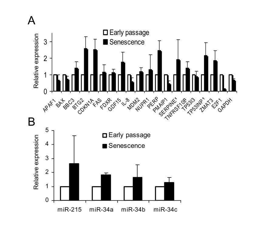 We then examined the expression levels of 18 known p53 target genes in early passage and senescent WI-38 cells using quantitative real-time PCR (Figure 2). The list included genes involved in p53 regulation (MDM2), cell cycle arrest (BTG2, CDKN1A/p21), apoptosis (BAX, BBC3/Puma, FAS), and others. Of the 18 genes tested, 14 showed similar or higher expression level in senescent cells compared to early passage cells (Figure 2A). Three genes, APAF1, BAX and IL-8, had slightly reduced expression levels in senescent cells (60%-70% of early passage), while only one gene, PMAIP1 (NOXA), showed more than two-fold lower expression. The transcription of cell cycle genes, p21 and BTG2, was elevated more than two-fold in senescent cells, consistent with a previous report that p53 is preferentially recruited to promoter of growth arrest genes during replicative senescence [28]. As a control, the expression level of a housekeeping gene, GAPDH, was also determined. It showed slightly lower expression in senescent (65%) compared to early passage cells. The transcription level of E2F1, usually repressed in senescent cells [5], was found reduced by approximately 90% compared to early passage cell. We also examined basal expression levels of the p53 target microRNA genes: miR-34a, b, c [13,29], and miR-215 [30,31]], previously reported to contribute to cell cycle arrest and/or apoptotic activity of p53. All four microRNAs were expressed at similar (miR-34c) or higher (miR215, miR34a and b) levels in senescent cells compared to early passage cells (Figure 2B). These results indicated that despite SAHF formation, the basal level of transcription for the tested p53-regulated genes was equal or higher in senescent cells than their early passage counterparts.