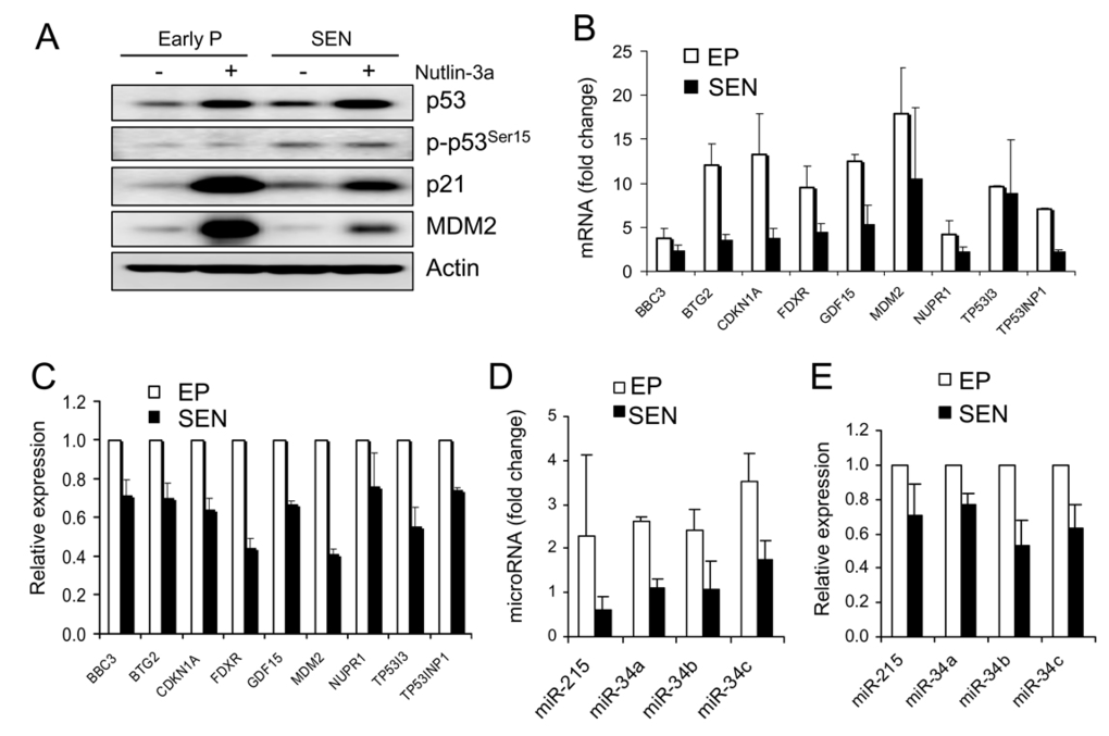 To evaluate the transcriptional activity of p53 without the effect of altered upstream signaling, we compared p53-induced levels of 9 genes found to be activated >2-fold by nutlin-3a in early passage WI-38 cells. Nutlin treatment produced comparable amount of p53 protein in early passage and senescent cells but it induced different mRNA levels in the two cell populations (Figure 3A, 3B). Eight out of nine genes were induced to lower levels in the senescent cells, and this status remain unchanged after normalization for total gene expression (Figure 3B, 3C), suggesting an overall decrease in p53 transcriptional activity. Similar observations were made with nutlin-induced expression of p53 regulated microRNA genes. All 4 microRNA genes were induced to lower levels in senescence (Figure 3D, 3E). Since nutlin does not require upstream signaling and produced practically equivalent amounts of p53 in both cell populations, these results lead to the conclusion that the ability of p53 to activate its transcription targets is compromised in senescent cells.