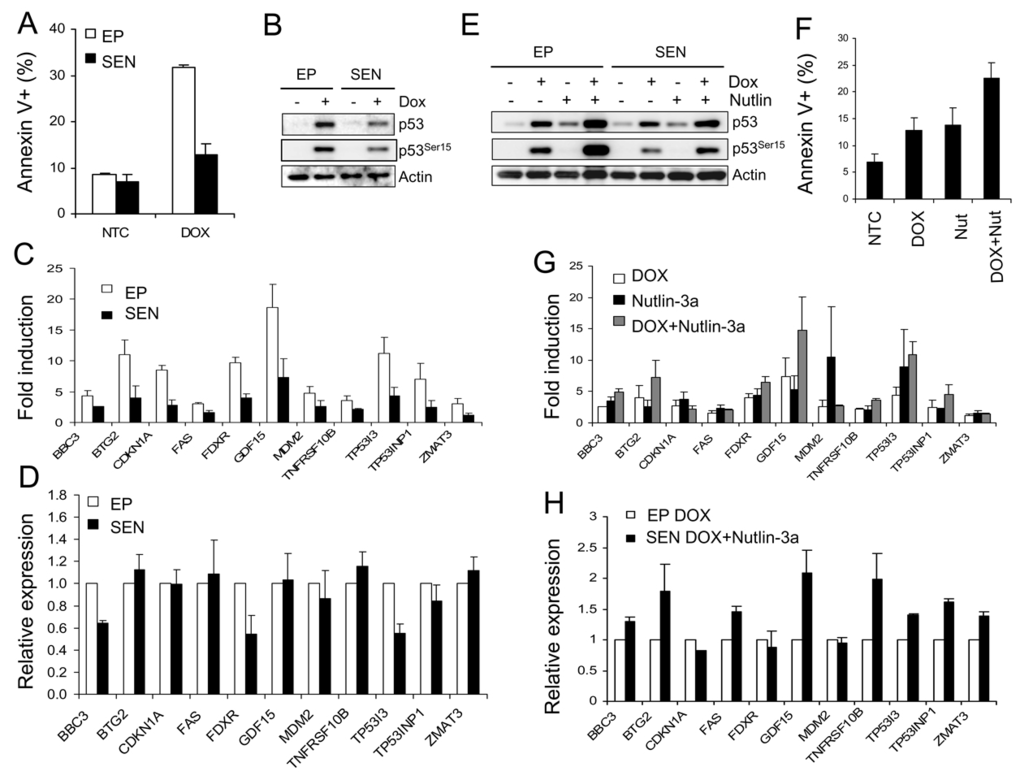 To examine if reduced apoptosis is due to reduction in activated p53 protein, its transcriptional activity, or changes in other components of downstream apoptotic signaling, we tested a combination of doxorubicin and nutlin. By inhibiting p53-MDM2 binding, nutlin can effectively stabilize p53 even in case of malfunctioning upstream p53 signaling. Therefore, nutlin could restore possible defects in upstream signaling and raise the level of doxorubicin-induced p53. Indeed, nutlin-doxorubicin combination induced higher p53 protein level in both early passage and senescent cells (Figure 4E). Although nutlin did not induce Ser-15 phosphorylation, it stabilized the phosphorylated p53 induced by doxorubicin in both early passage and senescent cells (Figure 4E). Thus nutlin/doxorubicin combination generated p53 protein levels comparable to doxorubicin-induced p53 in early passage cells and should restore both transcriptional and the apoptotic response if they are reduced due to lower p53 protein levels. In agreement with this expectation, the apoptotic fraction in senescent cells subjected to doxorubicin-nutlin combination increased to nearly 25% (Figure 4F), approaching the levels in early passage cells treated with doxorubicin alone (Figure 4A). Induced mRNA levels of the majority p53 target genes were found higher in the senescent cells exposed to doxorubicin-nutlin combination compared to doxorubicin alone, indicating higher transcriptional activity of the elevated p53 (Figure 4G). When gene transcription was normal-ized, all 11 genes showed the same or higher levels compared with early passage cells (Figure 3H), suggesting that reduced levels of activated p53 protein are the likely cause of reduced transcriptional activity in senescent cells. The restoration of p53 protein level and transcriptional response in senescent cells by nutlin/doxorubicin combination correlated with partial restoration of doxorubicin apoptotic activity in the senescent cell population. This indicated that attenuated p53 stabilization is a major contributor to the reduced apoptotic response to doxorubicin in senescent WI-38 fibroblasts. However, the incomplete restoration of apoptosis suggests that factors other than p53 protein level and transcriptional activity might also contribute to the overall level of apoptosis.