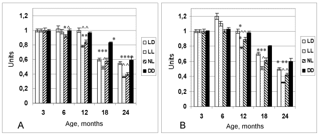 Age-related body weight gain followed by its decrease was observed in rats of all groups at any light/dark regimens. However maximal weight of rats maintained at the LD or NL regimens was observed at the age of 15 months, whereas in the animals kept at the LL - at the 12th month. The number of rats with abdominal obesity was increased in the LL and NL groups as compared with the LD group (data are not shown). Food consumption widely has been varying in all groups during the period of observation. There were periods of an increase in food consumption and those of a decrease. In general, in autumn and winter rats ate more lab food than in spring and summer. Male rats from the LL and NL groups ate more food compared with the LD group at the age of 18 and 21 months.