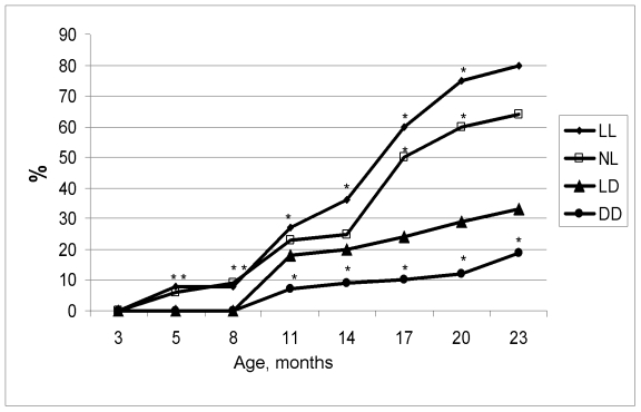 At the age of 6 months the coefficient of homeostatic stability (CHS) was practically same in all groups. Age-related decrease of the CHS was observed in all groups as well. However most significant decline of its value has been observed in the groups NL and LL. At the age from 12 to 24 months CHS in these groups was significantly lower in comparison to these in the LD group (Figure 1). In females, age-related increase in the number of rats with irregular estrous cycles was accelerated both in the NL and the LL groups whereas was postponed in the DD group (Figure 2). Thus, constant and natural illumination accelerated aging in rats evaluated by age-related dynamics of CHS.