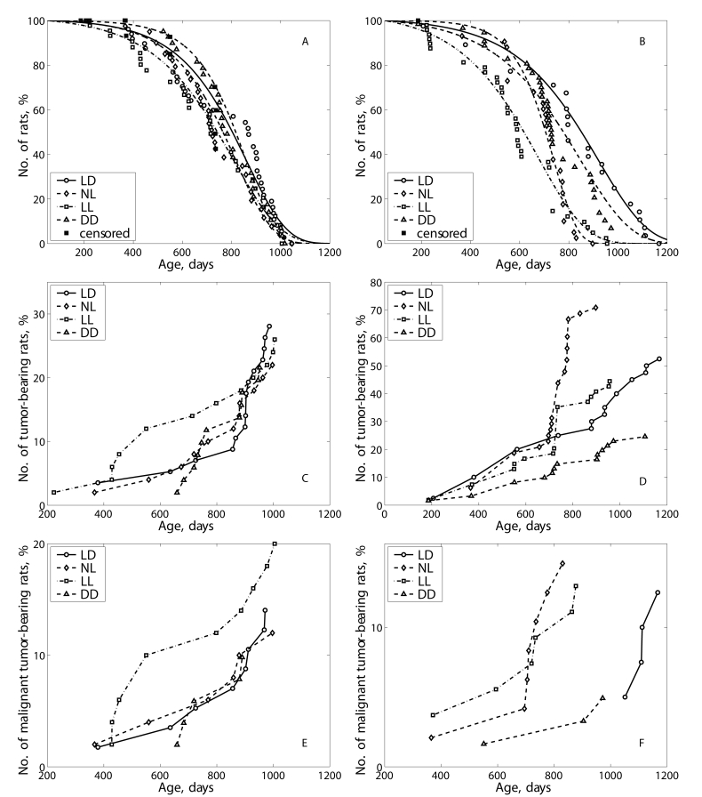 In male rats, the exposure to both NL and LL regimens failed significantly influence the mean life span of all as well as the last of 10% survivors (Table 1).