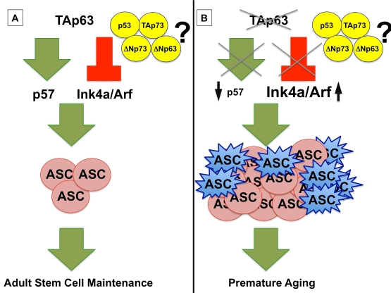 The mysterious mechanisms that regulate aging are an area of active research. The induction of senescence or apoptosis in stem and progenitor cells is thought to trigger premature organismal aging [2]. Consistent with this idea, we found that the TAp63-/- mice had a significantly shortened life span compared to its wild-type littermates [1]. These mice exhibited phenotypes associated with premature aging including kyphosis, impaired wound healing, alopecia, epithelial and muscular atrophy, and chronic nephritis. These phenotypes suggest a critical role for TAp63 in the maintenance of adult stem cells in multiple epithelial and non-epithelial tissues. Indeed, we found that TAp63 maintains dermal stem cells by transcriptionally activating the cyclin dependent kinase inhibitor, p57, thereby preventing hyperproliferation of these cells (Figure 1A) [1,3]. Similar to the phenotype identified in dermal and epidermal progenitor and stem cells, other adult stem cells in the TAp63-/- mice may be hyperproliferative early in life and through similar senescence mechanisms that we delineated may result in a depletion of these stem cells and premature organismal aging (Figure 1B) [1].