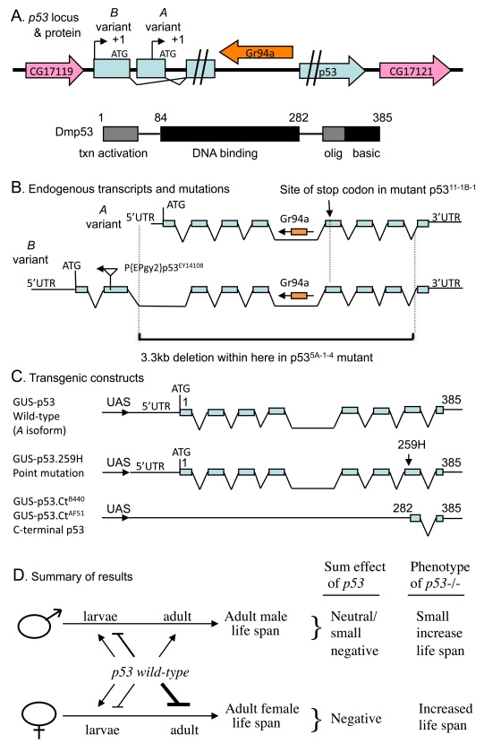 Mutant forms of p53 lacking function of a particular domain can have powerful dose-dependent effects that are often dependent upon the presence of wild-type p53 [3,9-11]. For example, specific truncated forms of mouse p53 can cause enhanced cancer resistance and accelerated aging phenotypes, generally interpreted as a state of p53 hyperactivation [12]. Based on studies in mammals it has been suggested that p53 may exhibit antagonistic pleiotropy between life-cycle stages, in that it favors normal development, fecundity and cancer resistance in young animals, but may promote aging in old animals [9,13-15]. Recently p53 gene activity was found to limit the life span of C. elegans hermaphrodites, and this effect was dependent upon the activity of the insulin/IGF1-like signaling (IIS) transcription factor gene Daf-16/FOXO [16]. In Drosophila, several dominant p53 mutations and transgenes have been characterized, that generally appear to antagonize p53 activity [3]. Nervous-tissue expression of one of these dominant p53 transgenes (p53 point mutation 259H) was found to inhibit IIS and extend life span in females [17,18]. However it remains unclear if and how p53 might normally affect the life span of Drosophila males and females. Here the wild-type form of p53, as well as mutant forms, were assayed for effects on Drosophila life span, in both male and female flies.