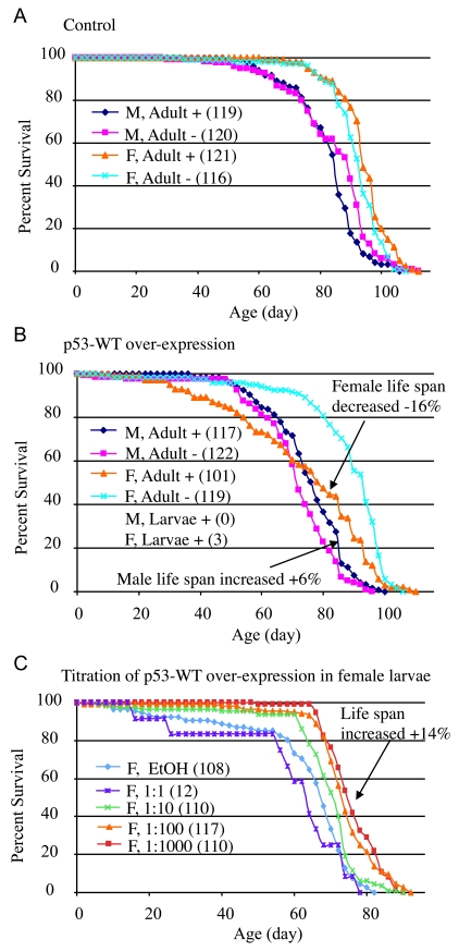 In these experiments a combination of genetic and transgenic approaches were used to study how p53 affects the life span of male and female Drosophila. The conditional transgenic system Geneswitch was employed to produce tissue-general expression of p53, either during development or specifically in adults. Detailed characterization of the Geneswitch driver strain ("Actin-GS-255B") using GFP reporter constructs demonstrated that the system yields truly tissue-general expression during larval development, as well as tissue-general expression in both male and female adults [22]. The data indicate that Drosophila p53 has effects on adult life span that are antagonistically pleiotropic between developmental stages and sexes (summarized in Figure 1A). One advance of the present study is that life span effects were identified using transgenes encoding the full length, wild-type form of Drosophila p53 protein, as well as ones encoding mutant forms. In adults, wild-type p53 over-expression limited life span in females and favored life span in males. In contrast, during development, p53 over-expression acted in a dose-dependent manner to either reduce or increase the subsequent longevity of both male and female adults: high level expression during development was detrimental, whereas moderate over-expression produced increased life span. The dominant mutation transgenes generally produced the opposite effect of wild type p53 transgenes, in both males and females. This indicates that the opposing effects of p53 transgenes on male and female life span cannot be simply due to some cryptic difference in the efficiency of transgene expression in males versus females, or to some differential toxicity of the encoded proteins in males versus females.