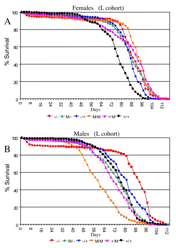 Several Drosophila p53 dominant mutations (M) were examined and found to have complex effects on adult life span, depending upon the particular allele, and whether or not a wild-type copy of p53 was present in the background (Figure 3; Supplementary Figure 2, Supplementary Figure 3). Some of the variability in life span across genotypes is expected to result from differences in genetic background. Indeed, the complexity of p53 dominant mutations and their interactions with genetic background has recently been reviewed [25]. Strikingly, when the data for the various p53 genotypes in the L cohort were grouped to control for genetic background effects, the dominant mutations tended to increase life span in females (+/M, -/M, M/M), and to decrease life span in males (+/M, M/M) (Figure 3; Supplementary Figure 2; Supplementary Table 4). Since the Drosophila p53 dominant mutations are generally expected to antagonize wild type p53 function, the increased life span of +/M females relative to wild type (+/+) is consistent with the results obtained above suggesting that, in sum, p53 limits the life span of females. However, for the M/M genotype flies, a wild-type copy of the entire p53 gene is not present, and these genotypes produced the greatest increase in life span in females and the greatest decrease in life span in males. Therefore, these data suggest that the mutant forms of p53 may have sexually antagonistic effects on Drosophila life span that are not necessarily dependent upon the presence of a wild-type p53. Strikingly, these effects of dominant mutations on life span were highly dependent upon environment, since in the W cohort the dominant mutations tended to decrease life span in both males and females (Supplementary Figure 3; Supplementary Table 7). It will be of interest in the future to determine what is the mechanism for these opposite effects of dominant p53 mutations in males versus fe-males, and to determine if the dramatic gene-by-environ-ment effect of p53 dominant mutations in females is due to the presence of mates, the richer food source, or both.
