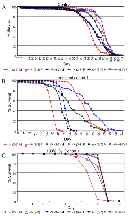 Drosophila p53 is required for normal resistance of larval cells and tissues to certain kinds of stress, for example, ionizing radiation and UV toxicity [26,27], and third-instar larvae that are null for p53 exhibit decreased survival when challenged with 4,000 Rads of ionizing radiation [28]. To determine if p53 genotype might have sex-specific effects on stress resistance in adult flies, male and female flies that were either wild-type or mutant for p53 were subjected to two types of life-shortening stress, ionizing radiation and 100% oxygen atmosphere, in replicated experiments (Figure 4, Supplementary Table 9). Treatment with 90,000 Rads of gamma-irradiation on day 10 of adult age reduced adult life spans by half, and p53 mutant female flies were again found to have greater mean life span than wild-type controls (+/-: +18%, 95% bootstrap CI [13.13 - 23.36]; log-rank p-value = 0; -/-: +13%, 95% bootstrap CI [9.09 - 16.71]; log-rank p-value = 2.98 x10-4). In contrast, p53 mutations were found to slightly reduce the survival of female flies subject to 100% oxygen atmosphere (-/+: not significantly different than wild-type; -/-: -4%, 95% bootstrap CI [-5.06 - -3.34]; log-rank p-value = 1.28 x10-13). In males, p53 null mutants subject to ionizing radiation had significantly reduced mean life span, whereas heterozygotes fared slightly better than wild-type (+/-: +4%, 95% bootstrap CI [1.80 - 6.00]; log-rank p-value = 2.02 x10-7; -/-: -19%, 95% bootstrap CI [-20.68 - -17.06]; log-rank p-value ≈ 0). As with females, p53 gene mutations tended to reduce male survival in response to a 100% oxygen environment (+/-: -4%, 95% bootstrap CI [-4.38 - -3.05]; log-rank p-value = 4.44 x10-16; -/-: -15%, 95% bootstrap CI [-16.13 - -14.10]; log-rank p-value ≈ 0). Therefore, wild-type p53 tended to favor the survival of both sexes under 100% oxygen stress conditions, yet was detrimental to female life span in flies subject to ionizing radiation. Therefore the results for adults subject to ionizing radiation were similar to those observed during normal aging: normal p53 function increased survival of males and decreased survival of females. The fact that p53 favored the survival of both sexes under the more severe life-shortening condition of 100% oxygen stress may be indicative of a threshold effect on survival that is sex-specific.