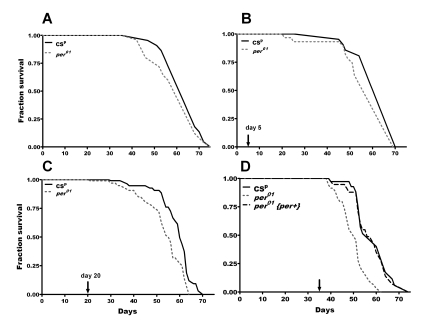 Fly rearing and l ife span analysis. Drosophila melanogaster were reared on yeast-cornmeal-molasses-agar diet (35g yeast/l) at 25°C in a 12-hour light/12-hour dark cycles; all experiments were performed 4-8 h after lights-on. The per01 mutant flies [10] were backcrossed 6 times to the Canton-S (CS) flies designated as CSP. To rescue per-function, we used transgenic flies carrying a wild-type copy of per (designated as perG) in a per01 background [35]. Males with two copies of perG (y wper01;{per+:32.1};+ were crossed with per01;+;+ females, and F1 males containing one copy of rescue construct designated per01{per+} were used. We confirmed their rhythmic locomotor activity indicating rescue of circadian clock function.