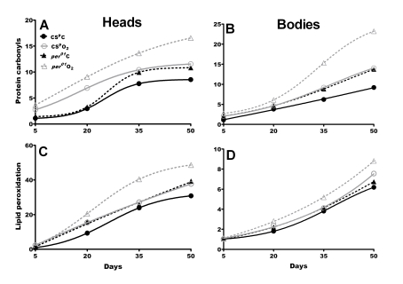 To compare lifespan and healthspan in flies with normal or disrupted circadian clock, we measured their ability to maintain ROS homeostasis during aging. We probed the health status of aging flies by exposing them to mild oxidative stress of 24h hyperoxia at increasingchronological ages, followed by assessment of the resulting oxidative damage and mortality hazards. Hyperoxia was chosen as a homeostatic challenge, because it directly leads to ROS production irrespective of age-related changes in food consumption and other physiological parameters [14].