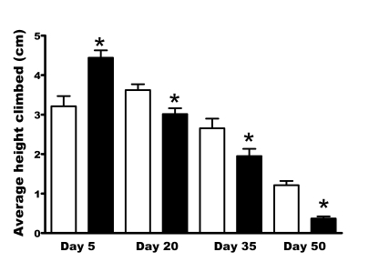 Our data show significantly higher accumulation of oxidative damage even in unchallenged per01 mutants under normoxia compared to age matched controls (Figure 2, Supplementary Table 2, Supplementary Table 3). As oxidative damage is one of the important biomarkers of aging, we asked whether other signs of aging are advanced in per01 mutants. First, we compared age-related locomotor performance between mutant and control flies. We used the RING assay, which utilizes negative geotaxis in Drosophila to assess climbing performance [15,16]. We measured climbing ability of per01 and CSp flies aged to day 5, 20, 35 or 50. Surprisingly, 5 day old per01 flies showed significantly higher climbing ability than control flies. In contrast, middle-aged and older per01 males showed significantly impaired climbing ability compared to age-matched controls (Figure 3). The difference was especially dramatic on day 50; at this age the average climbing ability of per01 males was approximately 4 fold lower than in CSp controls. This was partly caused by lack of vertical movement in many per01 flies at this age. The fact that young per01 mutant flies did not show impaired climbing demonstrate that the period gene does not affect fly geotaxis per se, but rather contributes to impaired climbing ability in an age-dependent fashion.