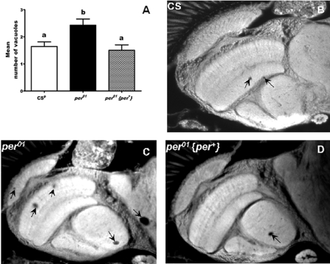Another indicator of aging that we tested in per01 flies was the health of their nervous system. As aging is associated with degenerative morphological changes in the central nervous system, we examined brain sections from 50 day old per01, CSp, and per01{per+} males. We evaluated number of vacuoles, as they reflect the level of neurodegenerative damage in the brain [17]. Brains of per01 males showed significantly (p<0.05) greater number of vacuoles than control CSp and per01{per+} flies with restored per function (Figure 4). These vacuoles, which were found mainly in the neuropils of the optic lobes and the central brain, lead to disrupted neuronal connections. Increased vacuolization in 50 day old per01 flies is consistent with their severely impaired mobility (Figure 3).
