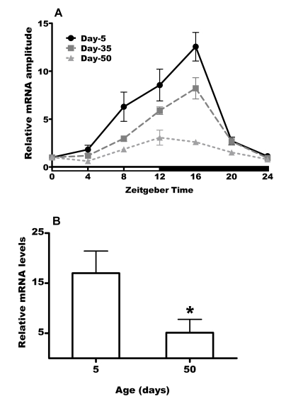 Since age related functional decline is accelerated in per01 flies compared to flies with normal clock, it was of interest to investigate daily profiles of per expression during aging in control CSp flies. Therefore, we used qRT-PCR to measure the expression levels of per mRNA extracted from flies collected every 4h for 24h at age 5, 35 and 50 days. As expected [11], per mRNA levels showed daily cycling with lowest levels in the morning and a peak at early night in the heads of young flies (Figure 5A). The levels of per between peak and trough changed with a 12-fold amplitude. This amplitude dampened significantly in 35 day old flies; however, there was still pronounced cycling of per mRNA with 8-fold amplitude. A dramatic dampening of per oscillation was observed on day 50 with the amplitude reduced to 2-fold. Comparison of the relative per mRNA levels at the peak showed significant reduction by ca 70% in 50 day old flies relative to peak expression levels in young flies. Since per encodes an essential component of circadian clock, our data suggest that the circadian network is severely impaired in old flies.