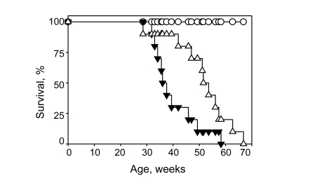 Statistical analyses. All statistical analyses were performed using SigmaStat 3.5 software (Systat Software, Inc., CA). Lifespan curves were calculated using Kaplan-Meier survival analysis; the statistical significance of curves was assessed using log-rank Mantel-Haenszel tests. P values <0.05 were considered as significant; the median, mean, and maximum survivals were calculated for each group.