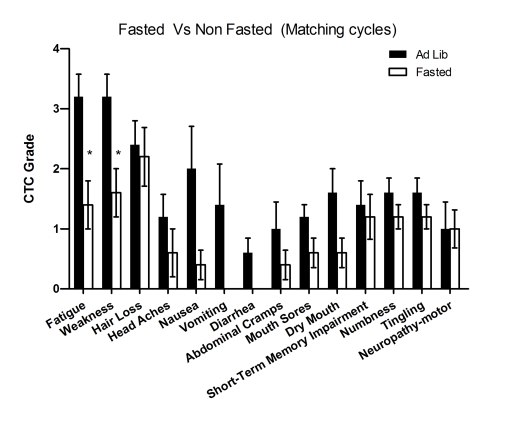 We obtained self-reported assessments of toxicity from all 10 patients who incorporated fasting with their chemotherapy treatments. Since many of the chemotoxicities are cumulative, we evaluated serial data including all the combined fasting- and non-fasting (ad libitum diet) associated chemotherapy cycles (Supplementary Figure 1). Toxicity was graded utilizing a questionnaire based on the Common Terminology Criteria for Adverse Events of National Cancer Institute, version 3.0 (Table 1). Although the lack of prospective collection of toxicity data and grading are a significant limitation, this series provide an early insight into the feasibility and potential benefit of combining fasting with chemotherapy. Fewer and less severe chemotherapy-induced toxicity was reported by all the patients, even though fasting cycles were often carried out in the later portion of the therapy (Supplementary Figure 1). Nausea, vomiting, diarrhea, abdominal cramps, and mucositis were virtually absent from the reports of all 10 patients in the cycles in which fasting was undertaken prior to and/or following chemotherapy; whereas at least one of these symptoms was reported by 5 out of the 6 patients during cycles in which they ate ad libitum (Supplementary Figure 1). The four patients that fasted throughout their treatments reported low severity for the majority of the side effects, in contrast to the typical experience of cancer patients receiving the same chemotherapy regimens (Figures 8I, 9, 10, 11H). For the 6 patients who received chemotherapy with or without fasting, we compared the severity of the self-reported side effects in the 2 closest fasting/non-fasting (ad libitum diet) cycles in which the patient received the same chemotherapy drugs at the same dose. There was a general and substantial reduction in the self-reported side effects in combination with fasting (Figure 1). Symptoms such as fatigue and weakness were reported to be significantly reduced (p< 0.001 and p< 0.00193, respectively), whereas vomiting and diarrhea were virtually absent in combination with fasting (Figure 1). In addition, there was no side effect whose average severity was reported to be increased during fasting-chemotherapy cycles (Figure 1 and Supplementary Figure 1).