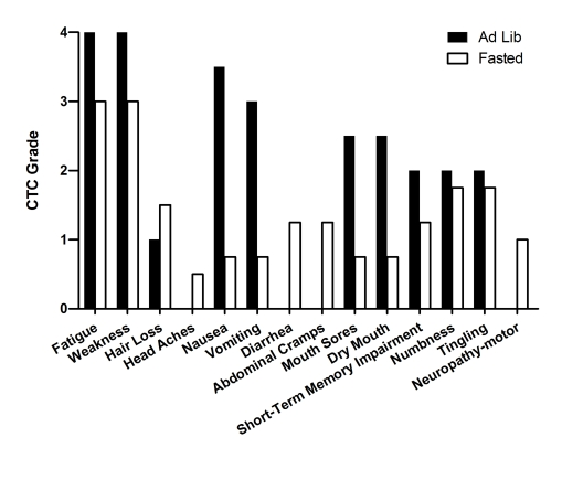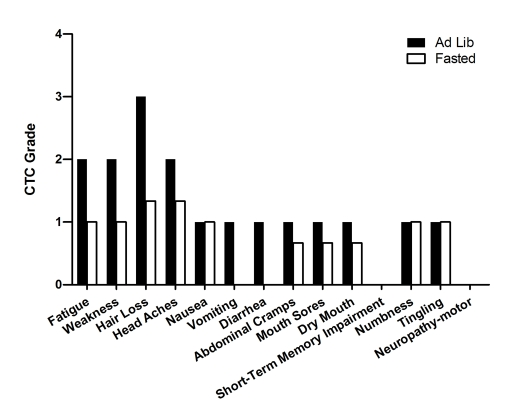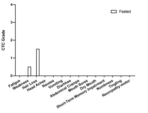In summary, in this small and heterogeneous group of cancer patients, fasting was well-tolerated and was associated with a self-reported reduction in multiple chemotherapy-induced side effects. Although bias could affect the estimation of the side effects by the patients, the case reports presented here are in agreement with the results obtained in animal studies and provide preliminary data indicating that fasting is feasible, safe and has the potential to differentially protect normal and cancer cells against chemotherapy in humans. Nevertheless, only a clinical trial, such as the randomized controlled clinical trial currently carried out at the USC Norris Cancer Cen-ter, can establish whether fasting protects normal cells and increases the therapeutic index of chemotherapies.