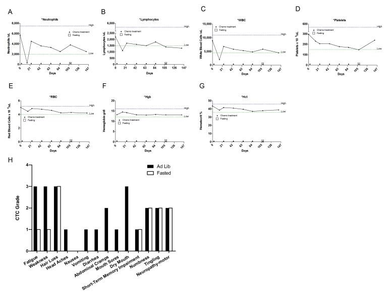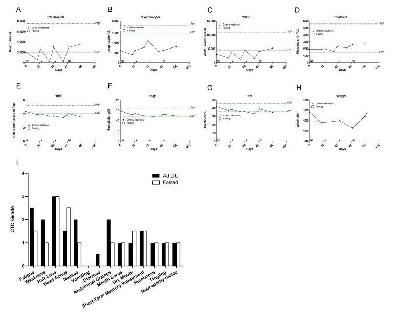 This is a 51-year-old Caucasian woman diagnosed with stage IIA breast cancer receiving adjuvant chemo-therapy consisting of docetaxel (TAX) and cyclophosphamide(CTX). She fasted prior to her first chemotherapy administration. The fasting regimen consisted of a complete caloric deprivation for 140 hours prior and 40 hours after chemotherapy (180 hours total), during which she consumed only water and vitamins. The patient completed this prolonged fasting without major inconvenience and lost 7 pounds, which were recovered by the end of the treatment (Figure 2H). After the fasting-chemotherapy cycle, the patient experienced mild fatigue, dry mouth and hiccups (Figure 2I); nevertheless she was able to carry out her daily activities (working up to 12 hours a day). By contrast, in the subsequent second and third treatment, she received chemotherapy accompanied by a regular diet and complained of moderate to severe fatigue, weakness, nausea, abdominal cramps and diarrhea (Figure 2I). This time the side effects forced her to withdraw from her regular work schedule. For the forth cycle, she opted to fast again, although with a different regimen which consisted of fasting 120 hours prior to and 24 hours post chemotherapy. Notably, her self-reported side effects were lower despite the expected cumulative toxicity from previous cycles. Total white blood cell (WBC) and absolute neutrophil counts (ANC) were slightly better at nadir when chemotherapy was preceded by fasting (Figure 2A, C; Supplementary Table 1). Furthermore, platelets level decreased by 7-19% during cycles 2 and 3 (ad libitum diet) but did not drop during the first and forthcycles (fasting), (Figure 2D). After the forthchemotherapy cycle combined with 144-hour fast her ANC, WBC, and platelet counts reached their highest level since the start of chemotherapy 80 days earlier (Figure 2A, C and D).