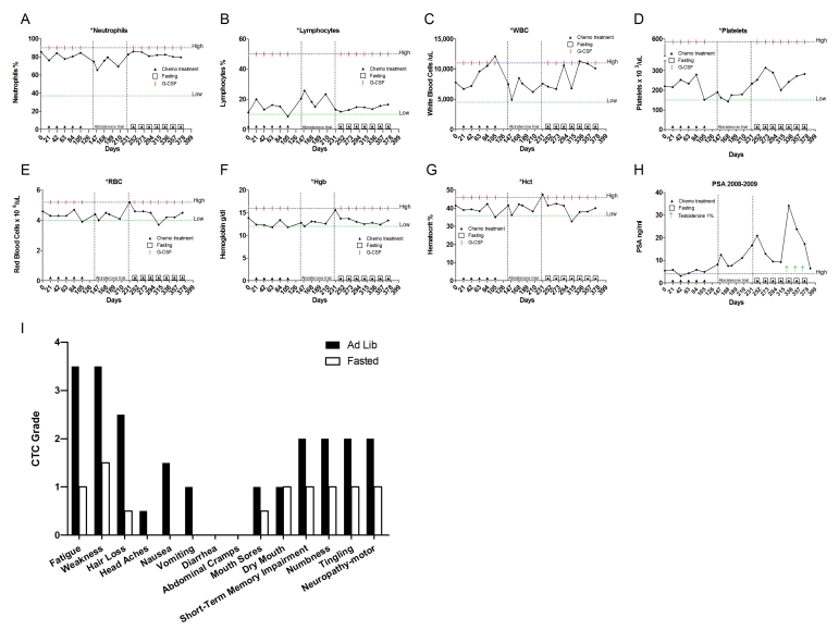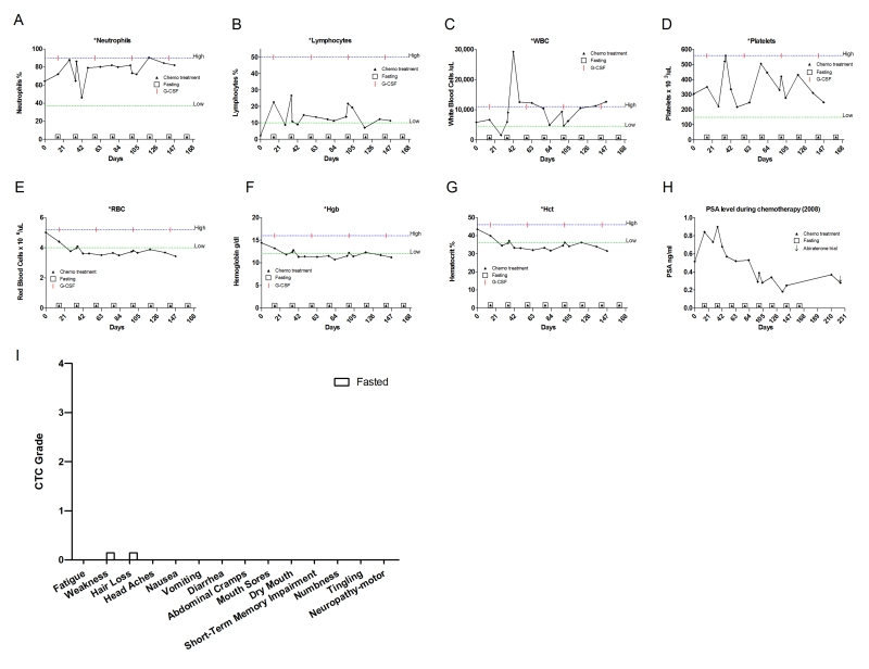 This is a 66-year-old Caucasian male who was diagnosed in July 1998 with prostate adenocarcinoma, Gleason score 8. A Prosta Scint study performed in the same year displayed positive uptake of the radiotracer in the right iliac nodes, consistent with stage D1 disease. The patient was treated with leuprolide, bicalutamide and finasteride. In December 2000, the diseases progressed. He started on a second cycle with leuprolide acetate and also received High Dose Rate (HDR) brachytherapy and external beam radiation with Intensity Modulated Radiation Therapy (IMRT) to the prostate and pelvis. In April 2008, a Combidex scan revealed a 3 x 5 cm pelvic mass and left hydronephrosis prompting initiation of TAX chemotherapy supplemented with G-CSF. The patient received 60-75 mg/m2 of TAX for 8 cycles. Throughout this period the patient fasted for 60-66 prior to and 8-24 hours following chemotherapy(Table 2). Side effects from fasting included grade one lightheadedness (accordingly CTCAE 3.0) and a drop in blood pressure, none of which interfered with his routine. Chemotherapy-associated self-reported side effects included grade one sensory neuropathy (Figure 8I). The patient's ANC, WBC, platelet and lymphocyte levels remained in the normal range throughout treatment, although he did develop anemia (Figure8A-G). PSA levels consistently decreased, suggesting that fasting did not interfere with the therapeutic benefit of the chemo-treatment (Figure 8H).