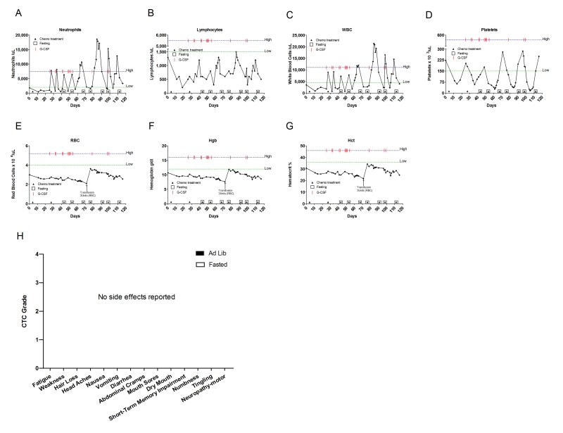 This is a 78 year-old Caucasian female diagnosed with HER2 positive breast cancer. After mastectomy, six cycles of adjuvant chemotherapy were prescribed with CBDCA 400 mg (AUC= 6), TAX (75mg/m2) complemented with G-CSF (Neulasta), followed by 6 months of trastuzumab (Table 2). Throughout the treatmen the patient fasted prior and after chemotherapy administration. Although the patient adopted fasting regimens of variable length, no severe side effects were reported (Figure 11H; Table 2). Her WBC, ANC, platelet and lymphocyte counts remained within normal levels (Figure11A-D) throughout the treatment, but she developed anemia (Figure11E-G).